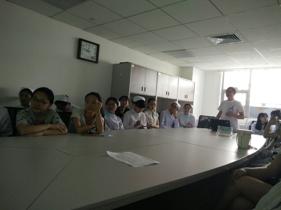 7月16日上午,护理学系7位老师在连云港第一人民医院多媒体示教室为护理专业实习生开展护理知识系列讲座,讲座由护理部胡怀宁老师主持。