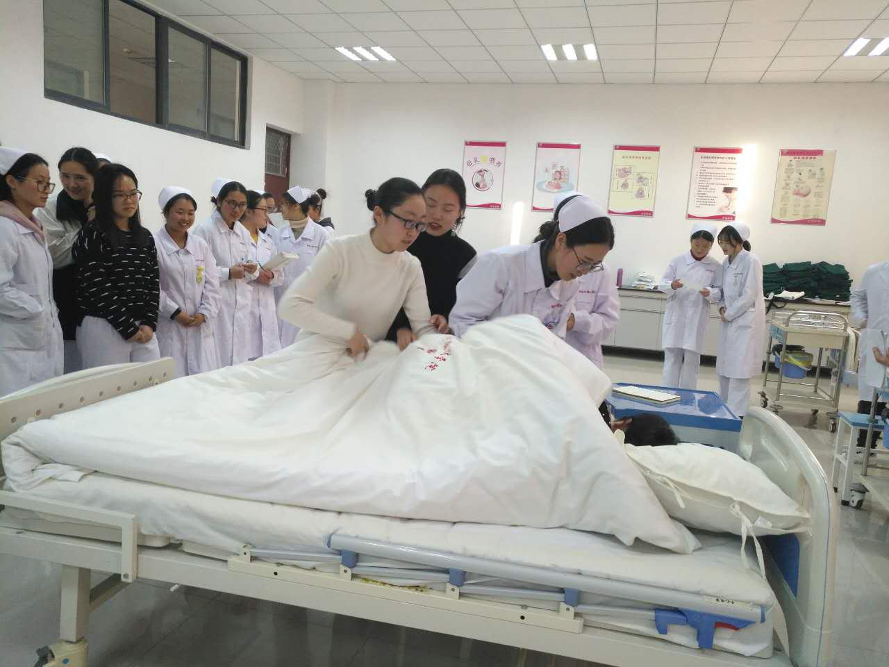 课前,单玲主任多次进行集体备课,与各位授课老师讨论,如何能更好将理论知识与实践相结合,如何能将学校的教育与临床更紧密。最终决定将护理程序的运用与临床工作能力考核相结合。