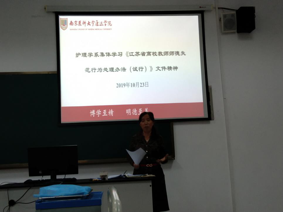 根据学校党委教师工作部的工作部署和要求,2019年10月23日下午,护理学系于护理楼104召开全体教职工大会,集中学习“江苏省高校教师师德失范行为处理办法(试行)”。